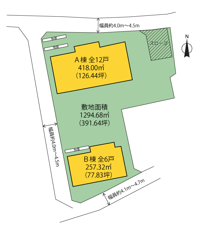 | 土地面積 | 1,294.68㎡ | 建物延べ床面積 | A棟374.84㎡ B棟214.16㎡ |